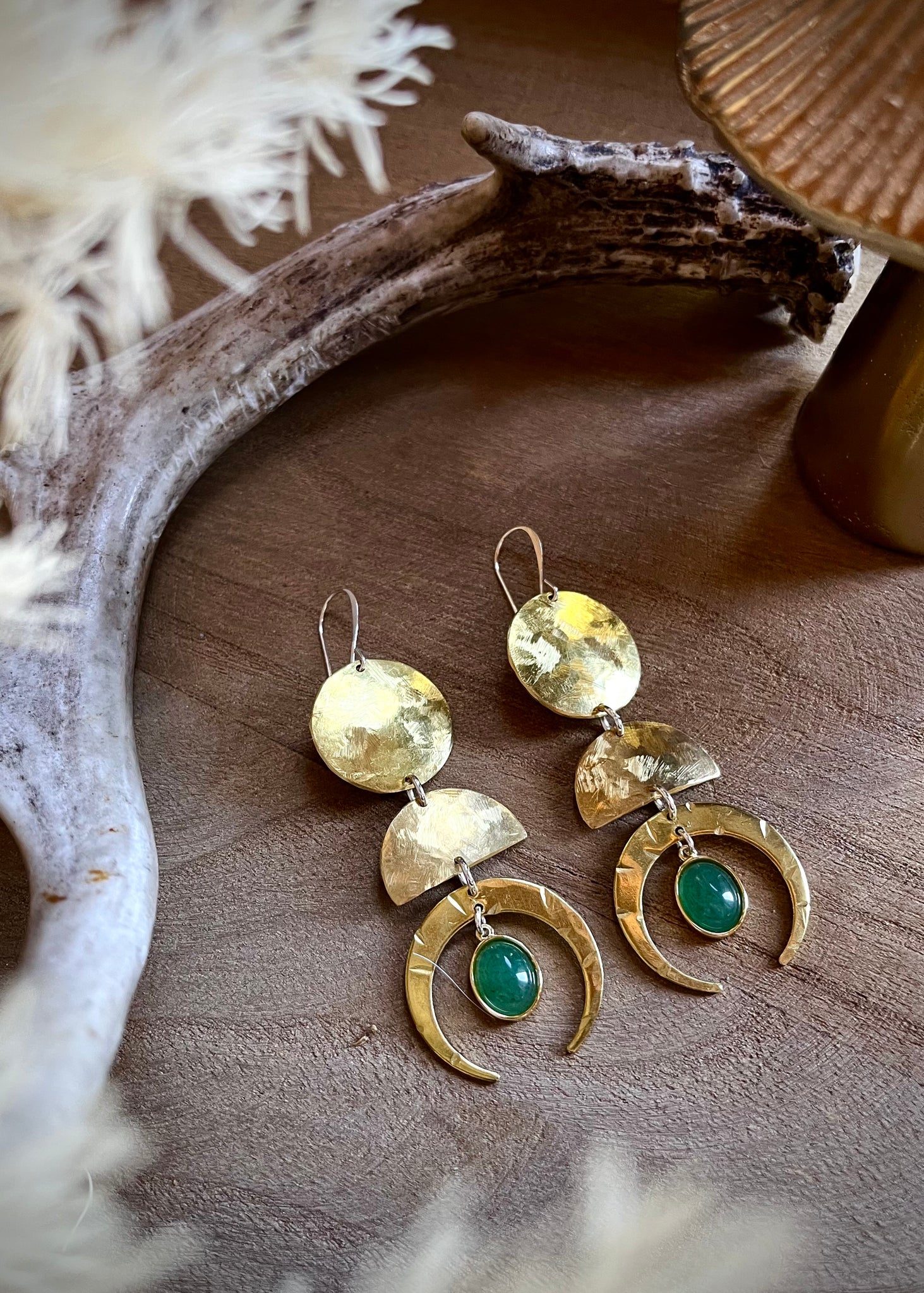 These beautiful statement earrings don’t carry too much weight and feature a subtle moon phase theme. These feature Aventurine set in an 18k gold filled setting