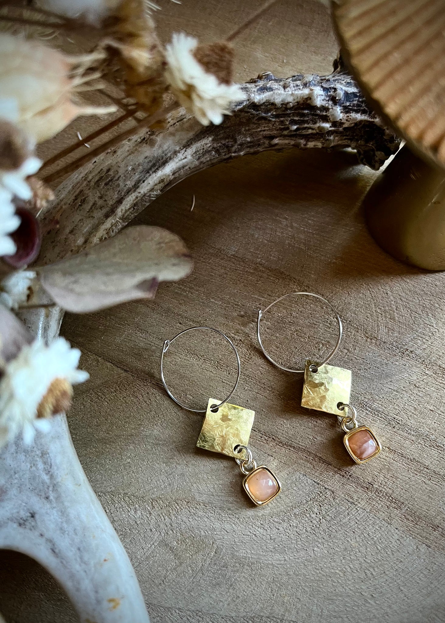 These feature hammered brass and sunstones set in an 18k gold filled setting