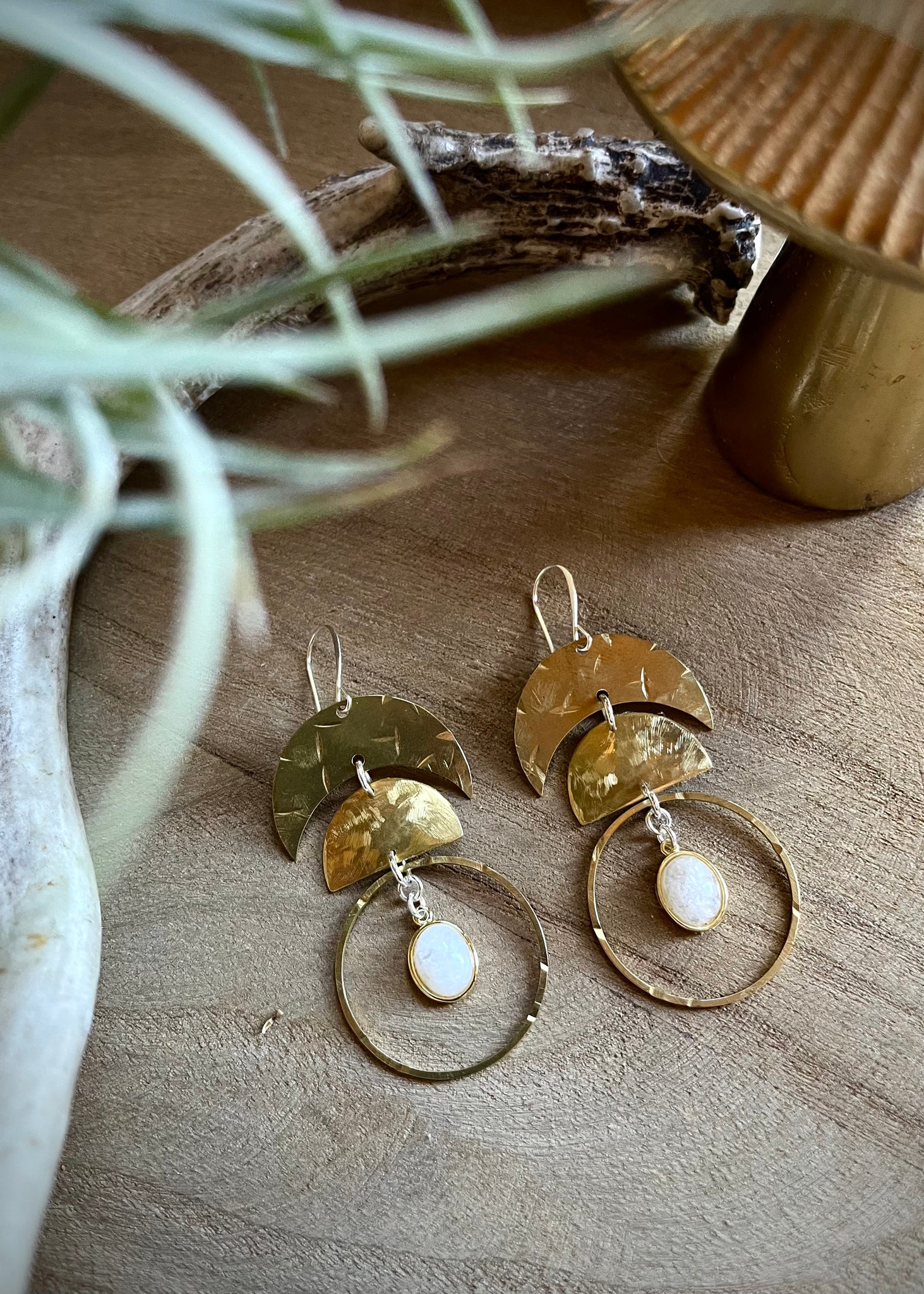 These beautiful statement earrings don’t carry too much weight and feature a subtle moon phase theme. These feature moonstone set in an 18k gold filled setting. All other findings are brass
