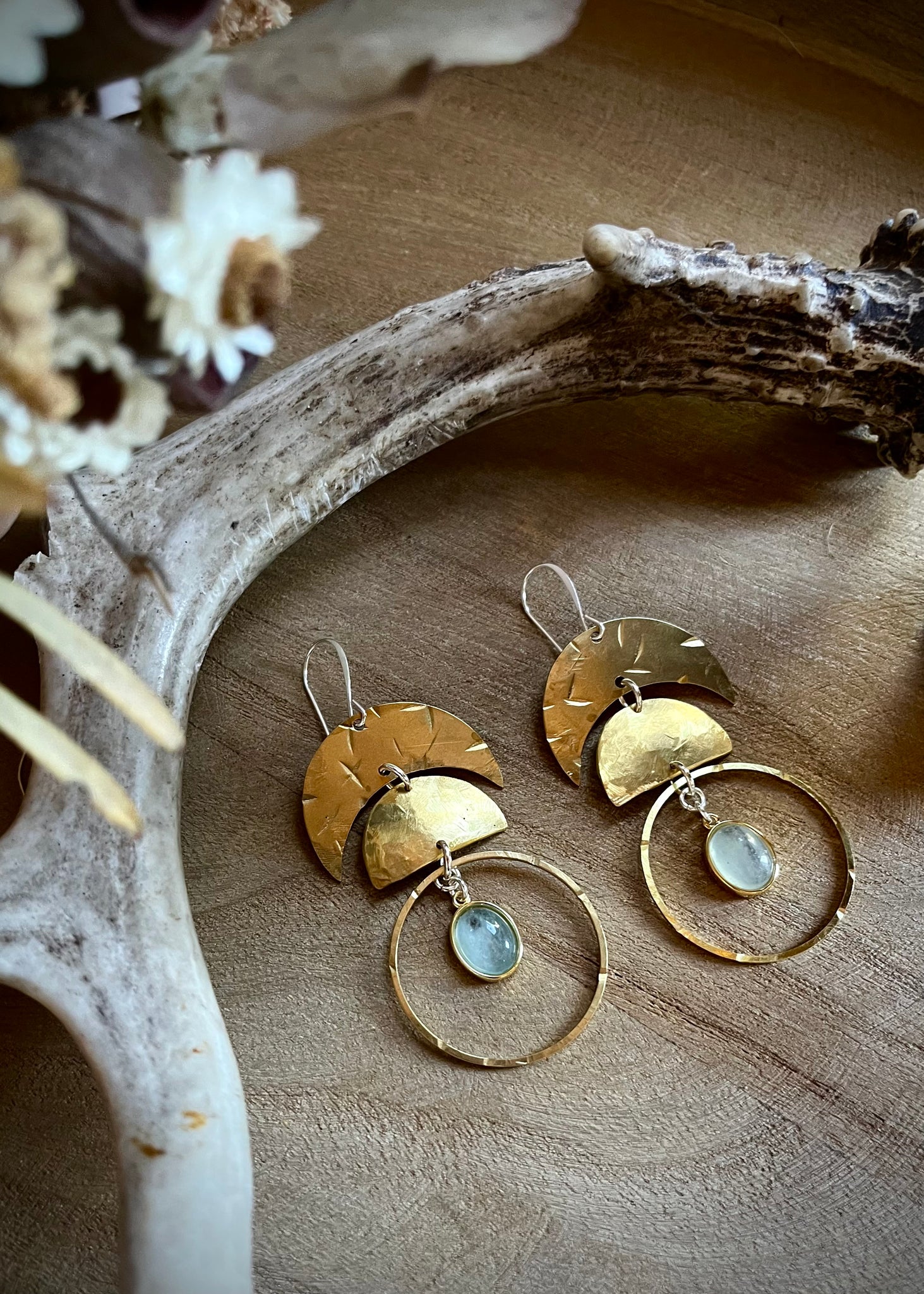These beautiful statement earrings don’t carry too much weight and feature a subtle moon phase theme. These feature blue jade set in an 18k gold filled setting.