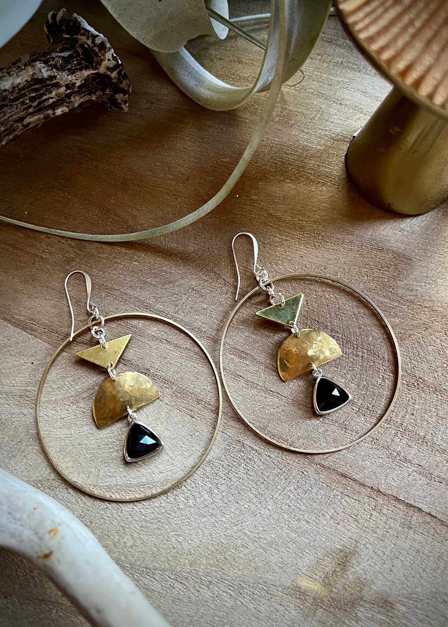 Large but light earrings feature hammered brass and onyx.